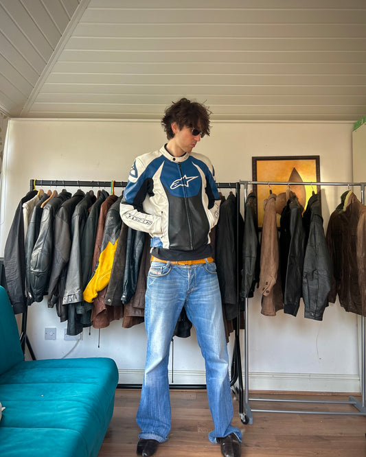 alpinestars white, blue & black padded leather biker jacket (M/L).