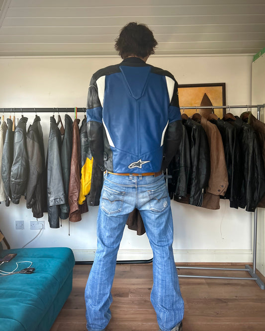 alpinestars black & blue leather padded biker jacket (L).